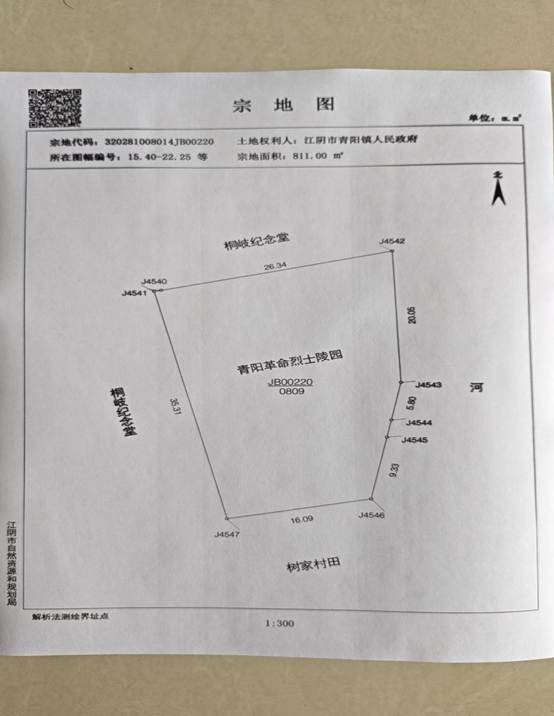 以青陽革命烈士陵園宗地圖(宗地代碼:320281008014JB00220,所在圖幅號:15.40-22.25等)為參照,具體保護范圍確定以烈士紀念碑為基準,西至桐岐紀念堂墓地通道,北至桐岐紀念堂消防河道,東至桐岐紀念堂消防河道,南至樹家村田區(qū)域。