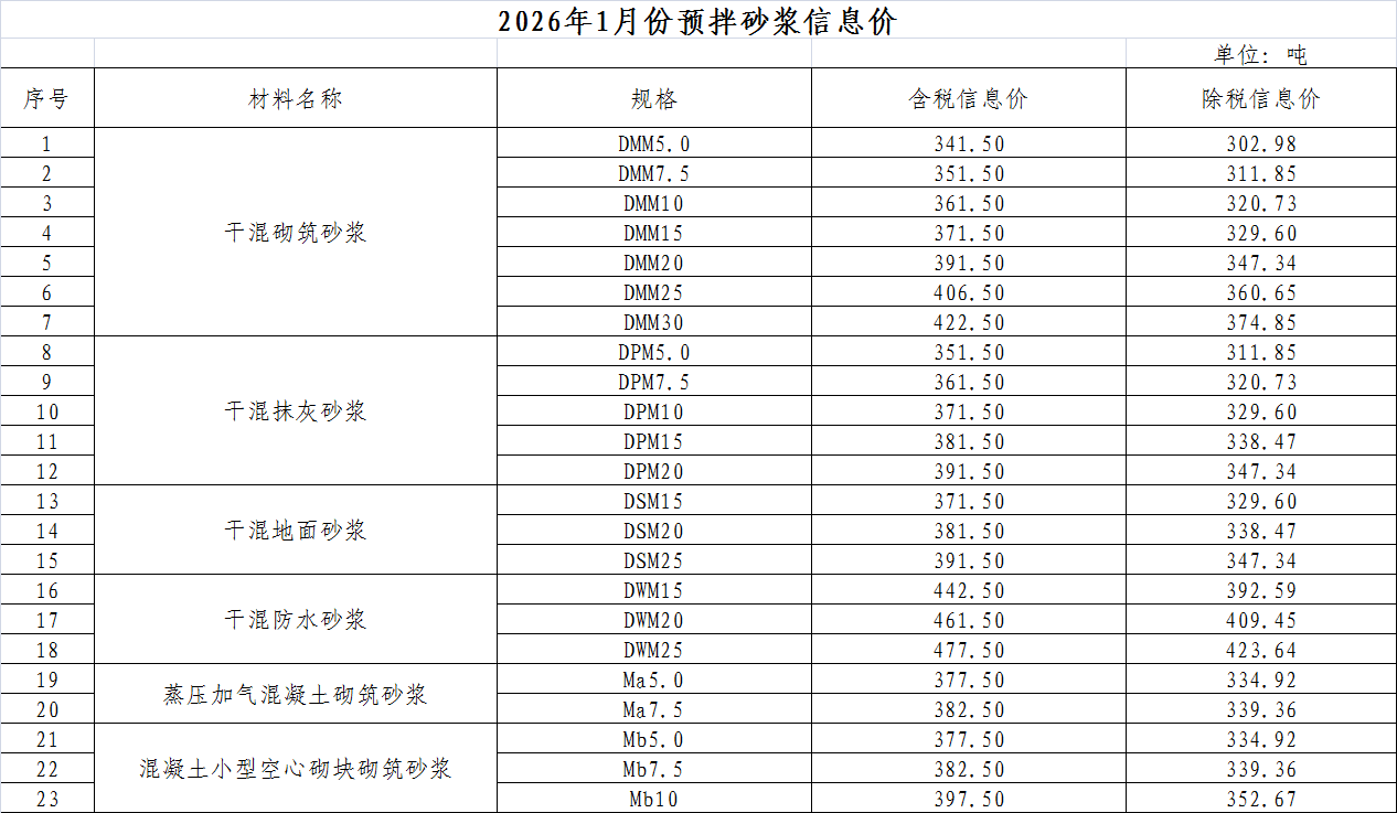 2026年1月份預拌砂漿信息價