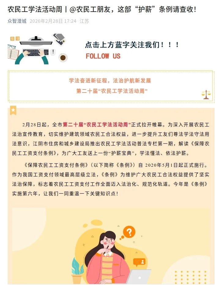 依托“眾智澄城”微信公眾號,開設農民工學法活動普法專欄,用通俗語言拆解要點,解讀《保障農民工工資支付條例》《中華人民共和國勞動法》《工傷保險條例》等與農民工息息相關的法律法規3次。